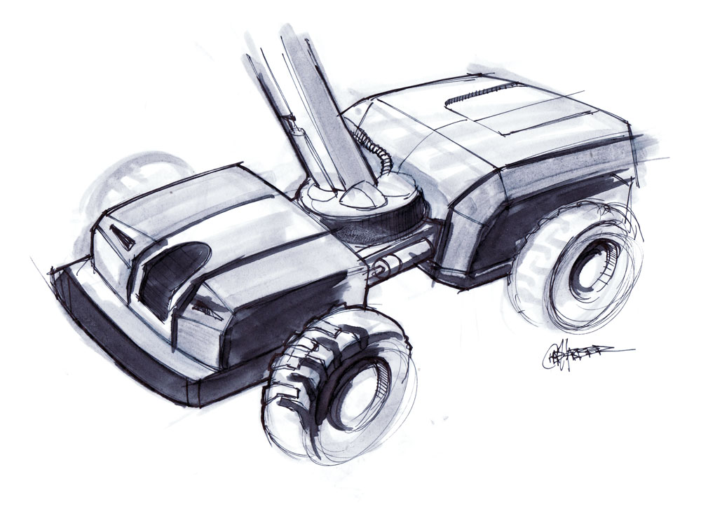 this sketch sparks interest for me. I don’t really know whats going on here (vehicle with huge stickshift?) which allows my imagination to roll. i like the way the sketch leaves the paper. shading and ghosting is good too.