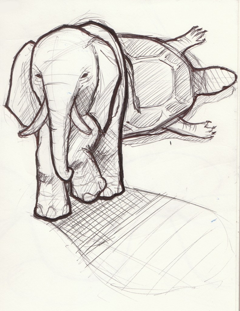 You should have drawn the carapace on top of the elephant. Like it’s wearing a soldier’s helmet. I liked it though.