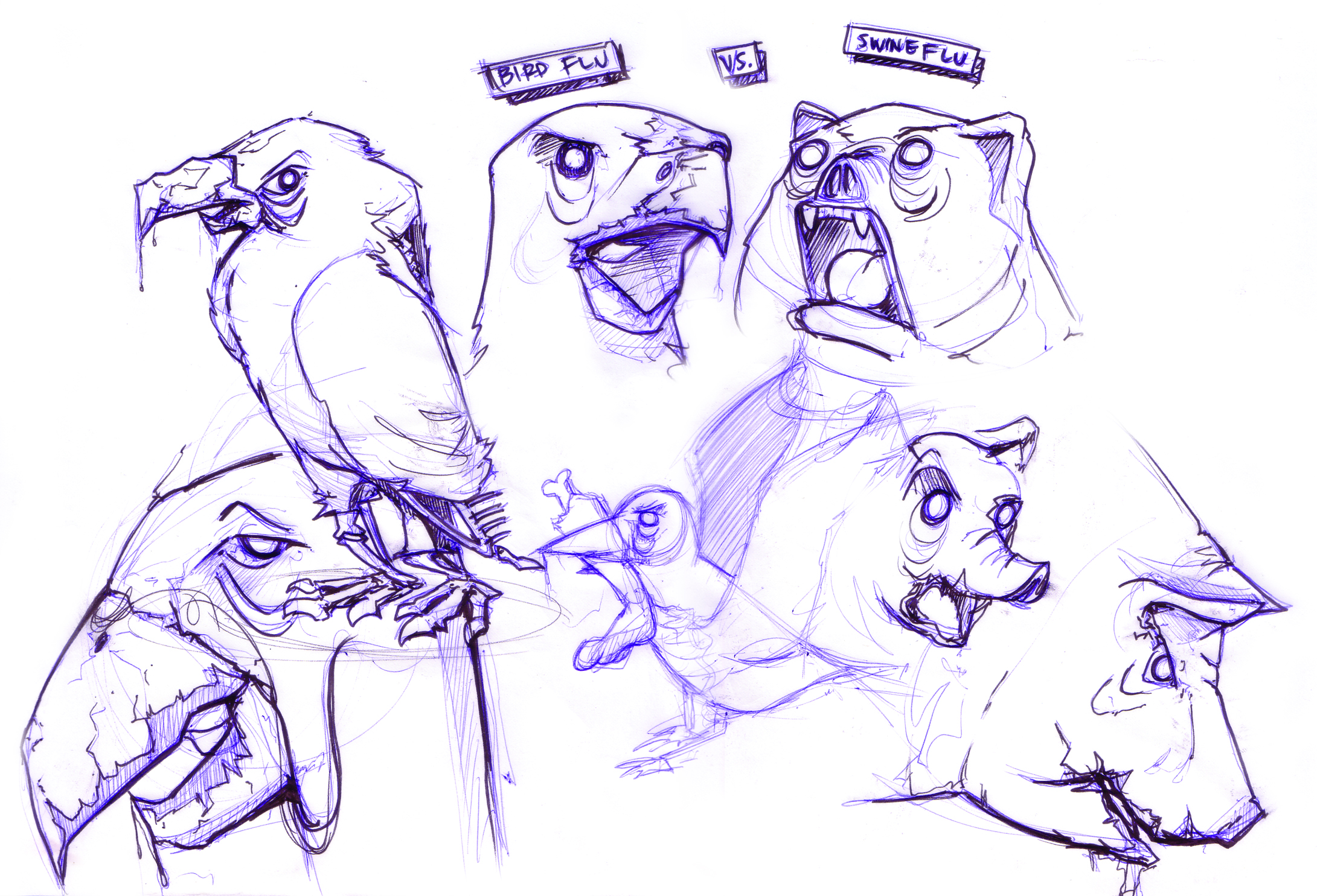Who would win?  I feel like the aerial attack of the zombie birds would really take the zombie pigs by suprise…but once the pigs got ahold of the birds, they may be no match for the ferousious jaws of the zombie pigs!  Your thoughts?!?!?birdvspigsps…this sketch was inspired by Jon’s amazing Pig Flu Zombies sketch below…if you have not seen it, take a good look!