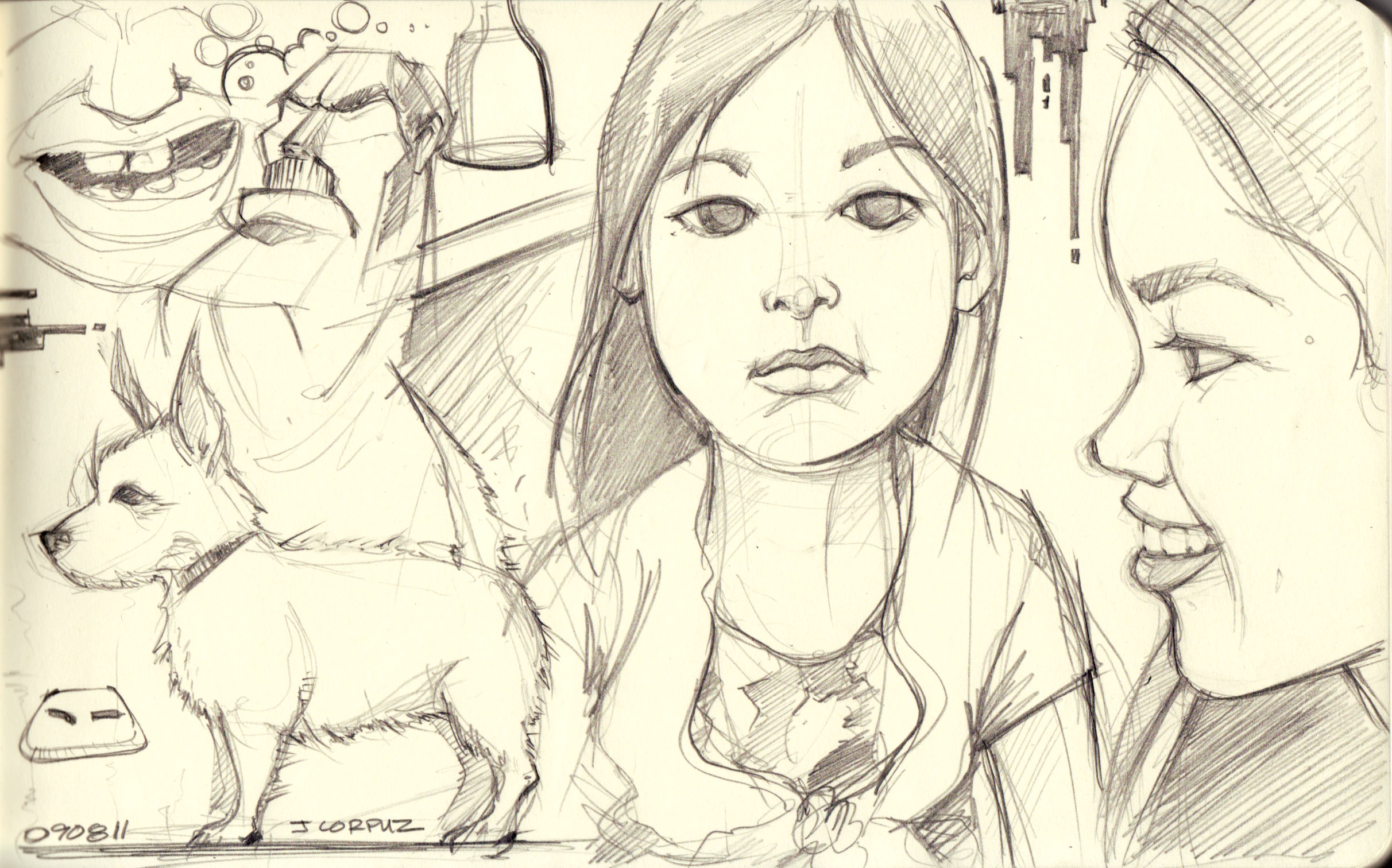 from left to right…a smile (i think)…a man with a huge square chin, tough as nails…my friends just got a baby terrier, his name is Rocky…my little niece Asia (whom i drew the Repunzel sketches for), she’s a big inspiration…my other key inspiration, my baby sister, Stacy, who just got a job teaching English (i used the mechanical pencil she bought me for my birthday to draw this)…