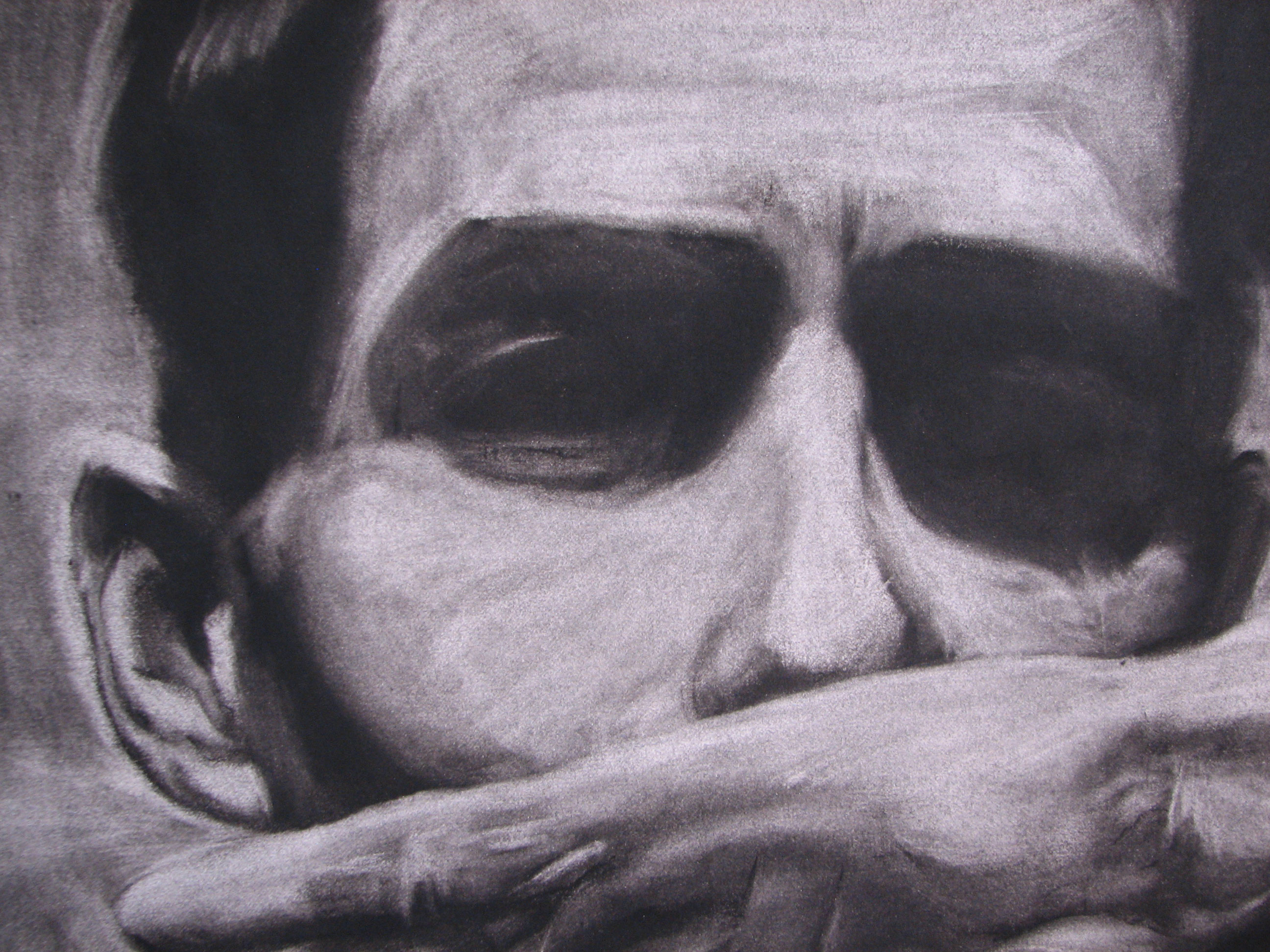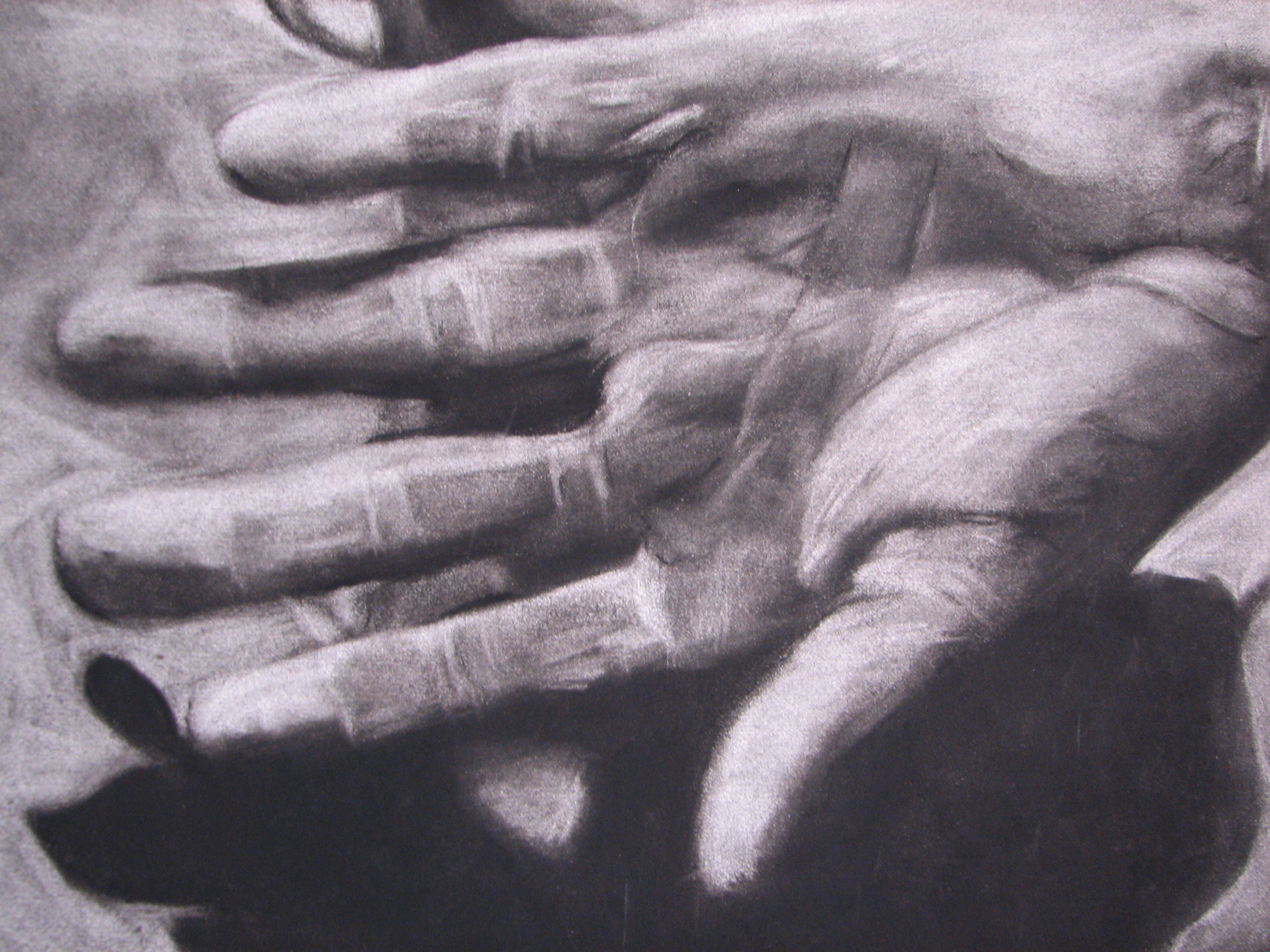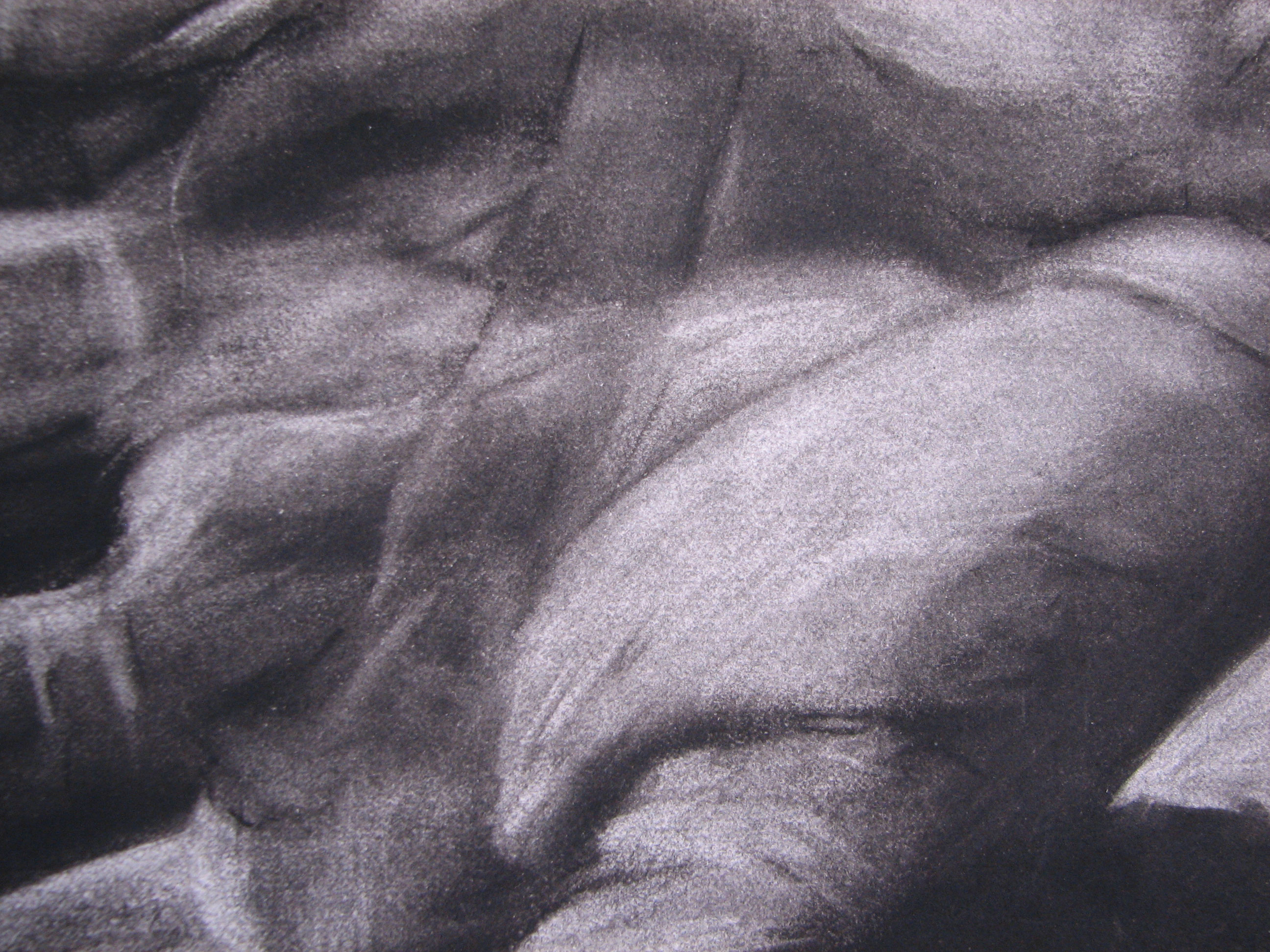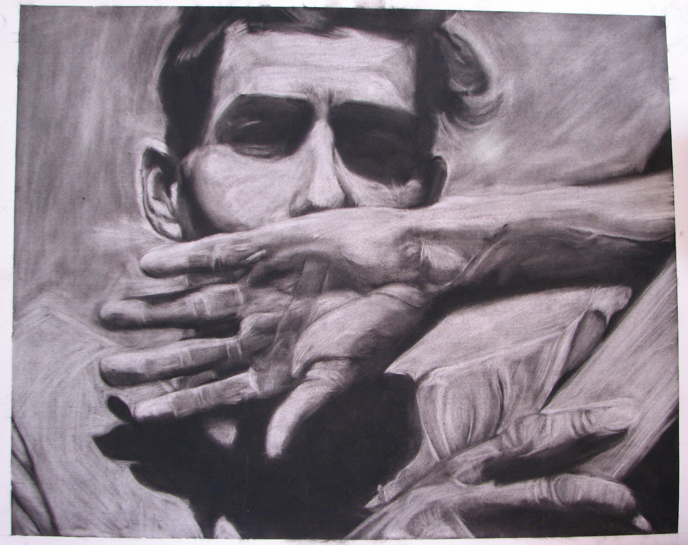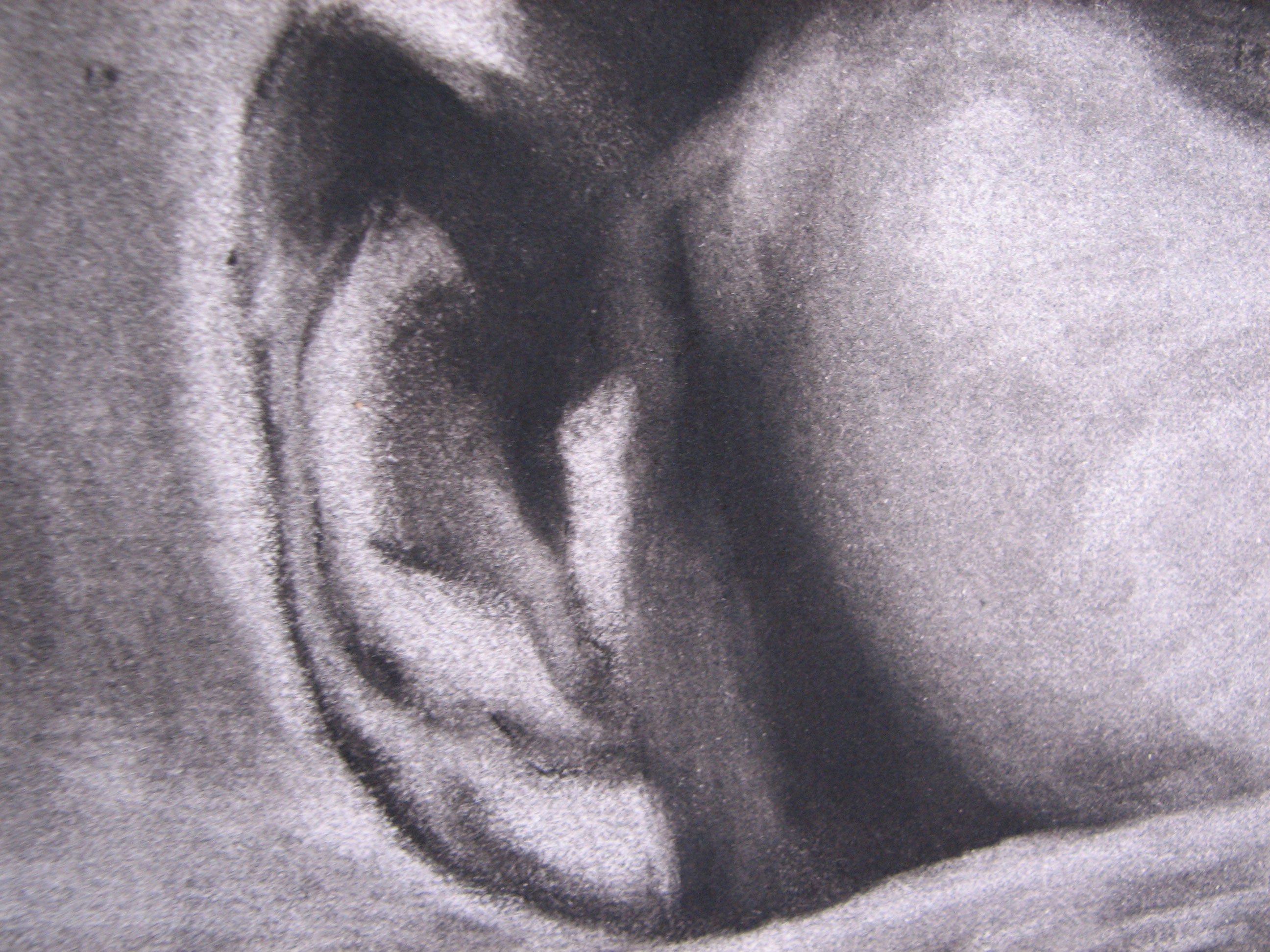 The following was one of my main projects, a photorealstic sketch using only dense charcoal and rubber kneaded eraser…we used a subtractive process where you start with a black base and then erase out the rendering, playing with contrast tone…I struggled so hard with this project and my final (a self portrait), as well as life drawing in general…