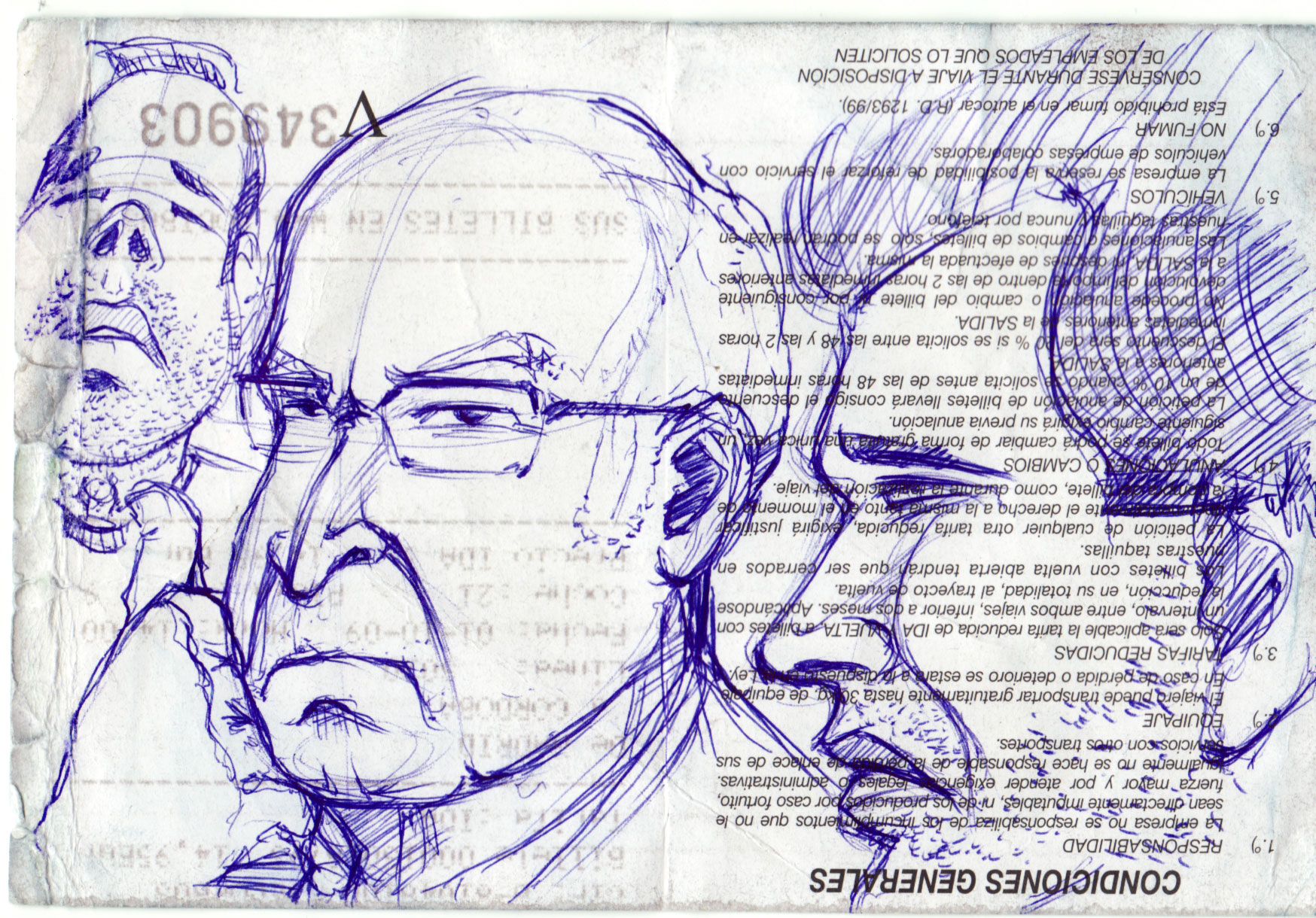Finally back…sorry for the leave of absence but the vacation was much needed…we have tons of pics that eventually will go up as well as sketches…so, we were on a train from Madrid to Barcelona, Dan was fast asleep, Dick Cheney was sitting behind us and Albert was sitting across from me…i sketched this on my train ticket…train-ride-web