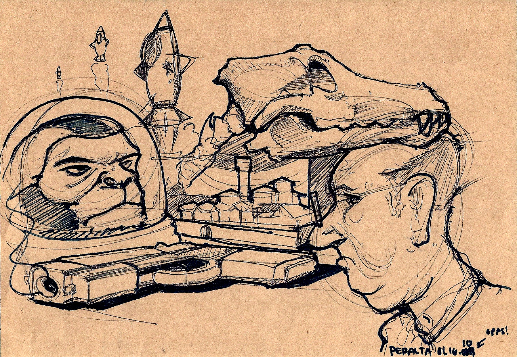 Sketching random things you see or imagine and composing them into one sketch, can be a pretty interesting way to spice up your content.  This is a combination of both things I came across, like the older gentleman on the right, the hand gun, and the city in the background…the skull, rocket ships and monkey in the space suit are from a Digital Art magazine.   Had a bunch of fun with this sketch, hell…who doesn’t like drawing monkeys?