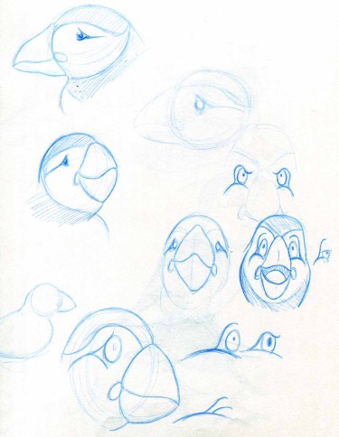 The second character was a challenge. Puffin’s are hard to draw. After doing many studies and drawing puffins for weeks, I got down to work to create Paco the Puffin who is a, how do you say, pretty flamboyant hair stylist.