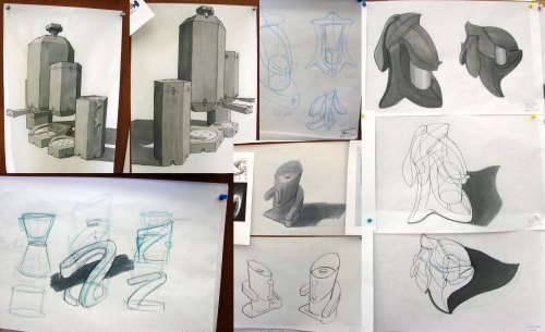 Construction, perspective, quick thumbnails for concept generation, and monochromatic renders (next term will be color and materials)