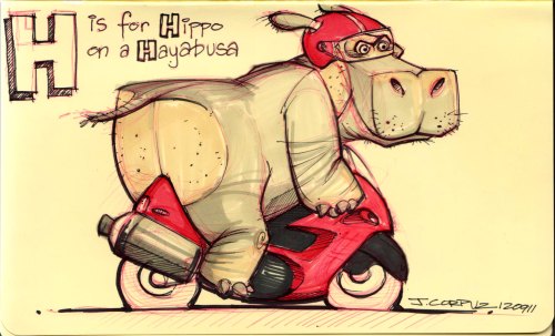 …for the letter “H“, Michael drew a Hedgehog in his racer…but Megan Hohlfeld wanted a Hippo on a Hayabusa, so I drew her one!
