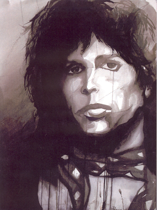 This is post 2 of the Rock Star series of portrait paintings. Steven Tyler was painted for my very close cousin Catrina, who has the painting hanging in her home. As well, I was fortunate enough to get the opportunity to hang the first print of this painting in Steven Tyler’s dressing room back in 2002 @ Shoreline Amphitheater. Prior to him going on stage he called my house and I spoke with him for several minutes! Really him!  He called to thank me for the gift ( I gave him the print that hung in the dressing room), so he now owns print 1.  I thought it was a friend playing a joke, but no, he said….”this is f***ing Steven Tyler man!” I then spoke with his band manager several time after that, regarding Tyler buying the original from me. We planned to meet up when they were in town, I kept in contact with them for a few years, but have since lost contact. Hopefully he still has the print…I like to think its hanging in his house somewhere.  If your watching our Lineweights page Steven Tyler…hit me up! Enjoy.