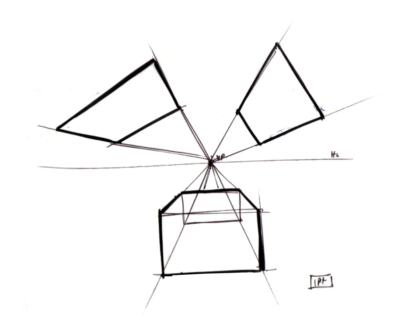 Finally, lets practice really quickly…the trickery that is 1pt perspective.  Converging lines, parallel lines, floating planes that could come crashing down at any moment…ahhhhhh!  1pt is a highly valuable tool, so make sure you think about your object it more than just 2-3pt, get back to basics…it will give you a whole new perspective on things.