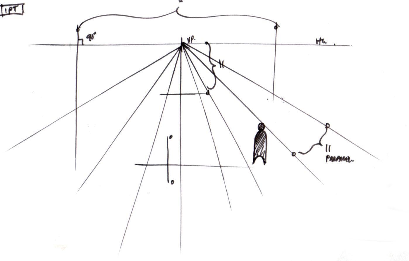 Lets take a quick step back for a second during this warm up, to remember our long forgotton and skipped over way of viewing objects with our eyes.  1pt perspective.  Its highly valuable, and often more tricky (with complex objects, eye level, etc)…buts lets get this trick all warmed up, cause you never know out on that sketching battle field what type of ammo you will need.  Check out the crazy lines here, just pointing out the Horizon Line, how all points converge but are parallel on given and designated planes, and the key is that you land your perpendicular line (which grounds it all).   All lines running perpendicular are dead parallel.  And dont you forget it!