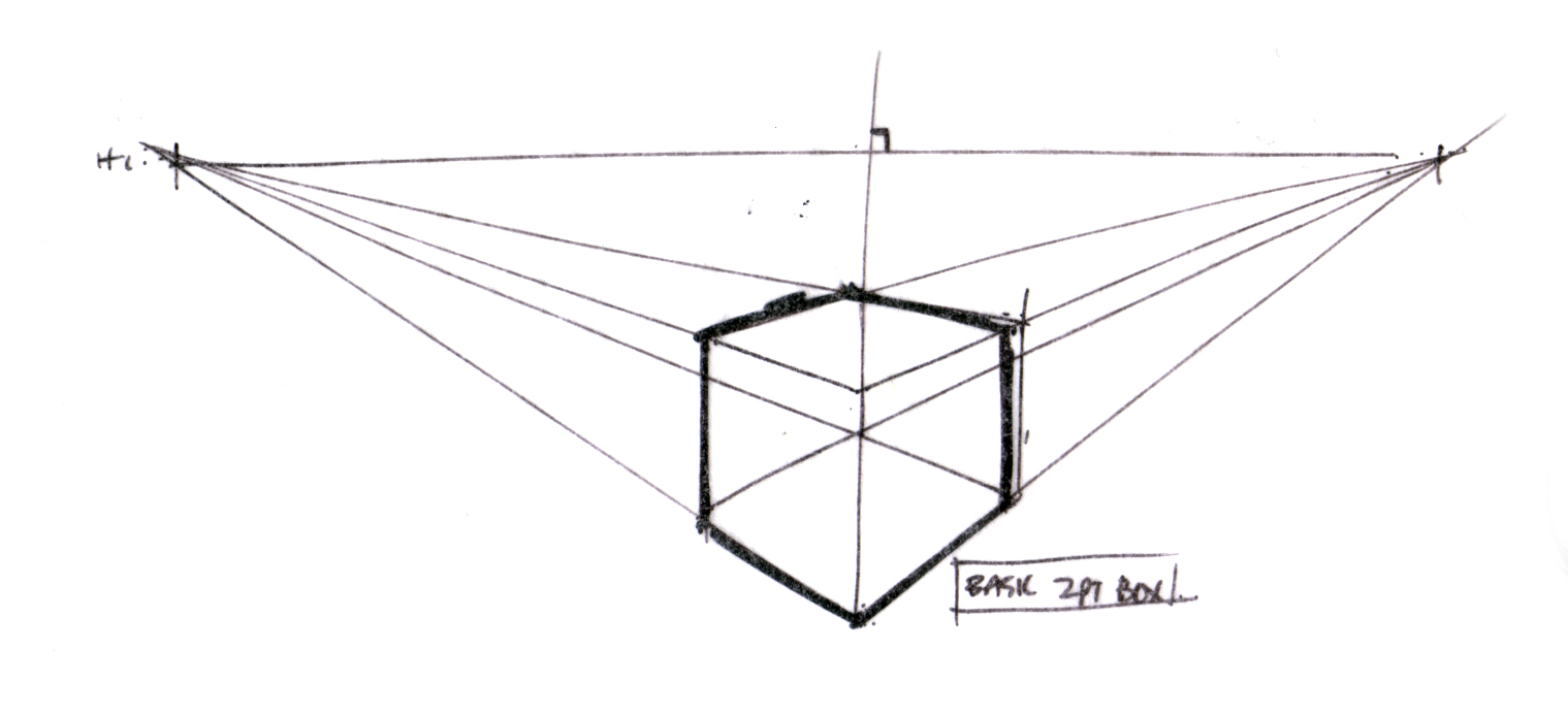 Lets do this thing.  Time to kick it up a notch huh?  BAM…basic 2pt perspective out of nothing.  Start with the dot to dot exercise and call that the Horizon Line, Boom.  Draw a 90 degree perpendicular at the center of where you want your object to live, son-of-a-bing.  Strike the bottom line from perpendicual line to the right horizon line, son-of-a-bam.  Strike the same line but to the left horizon line, son-of–boom.  Now do the same for the front top of your box.  Finding the back points of your box will take some repetition (and there is a technical formula to find it), but eyeball it for now.  Whammy…you got a 2pt Box.